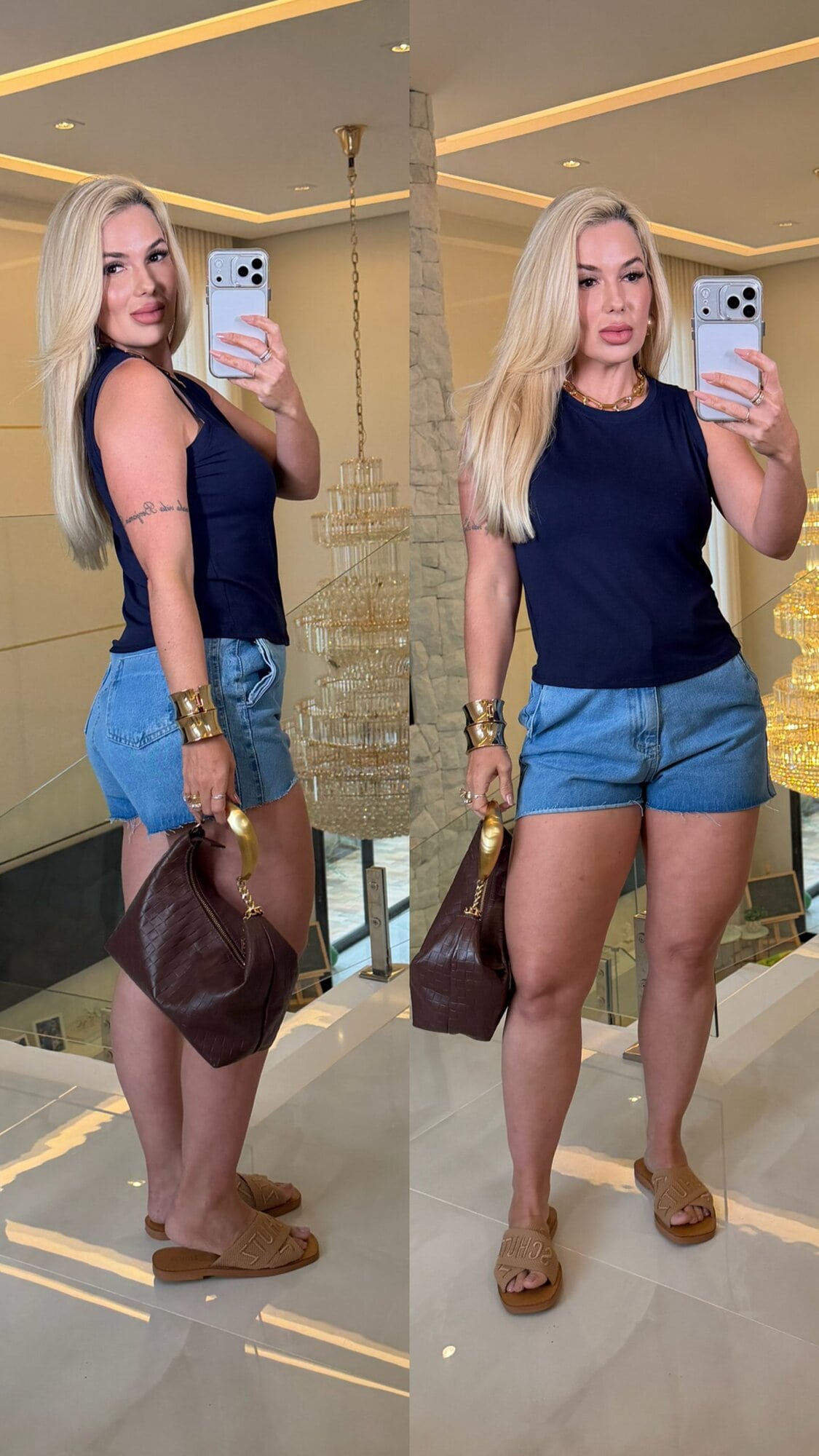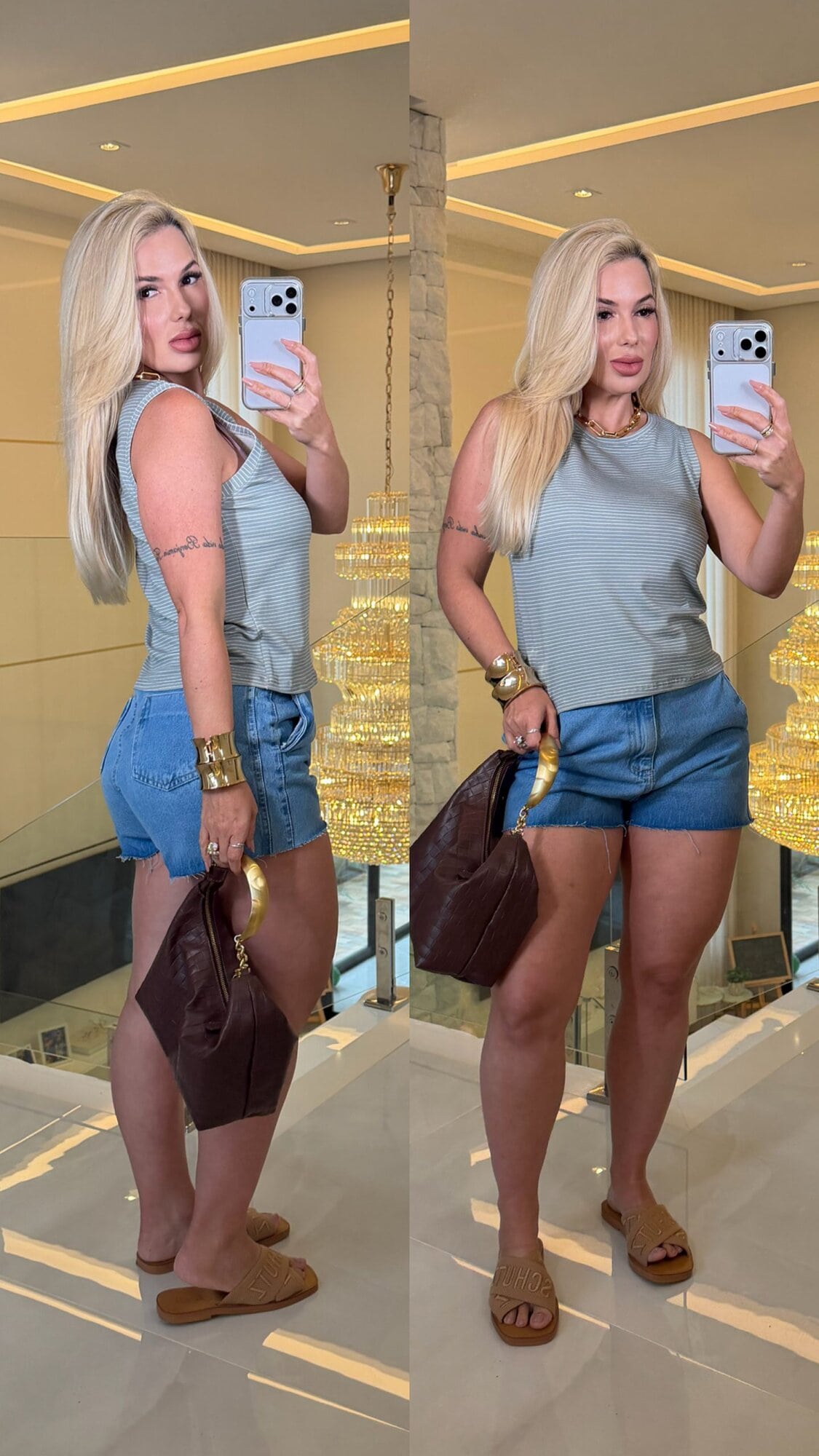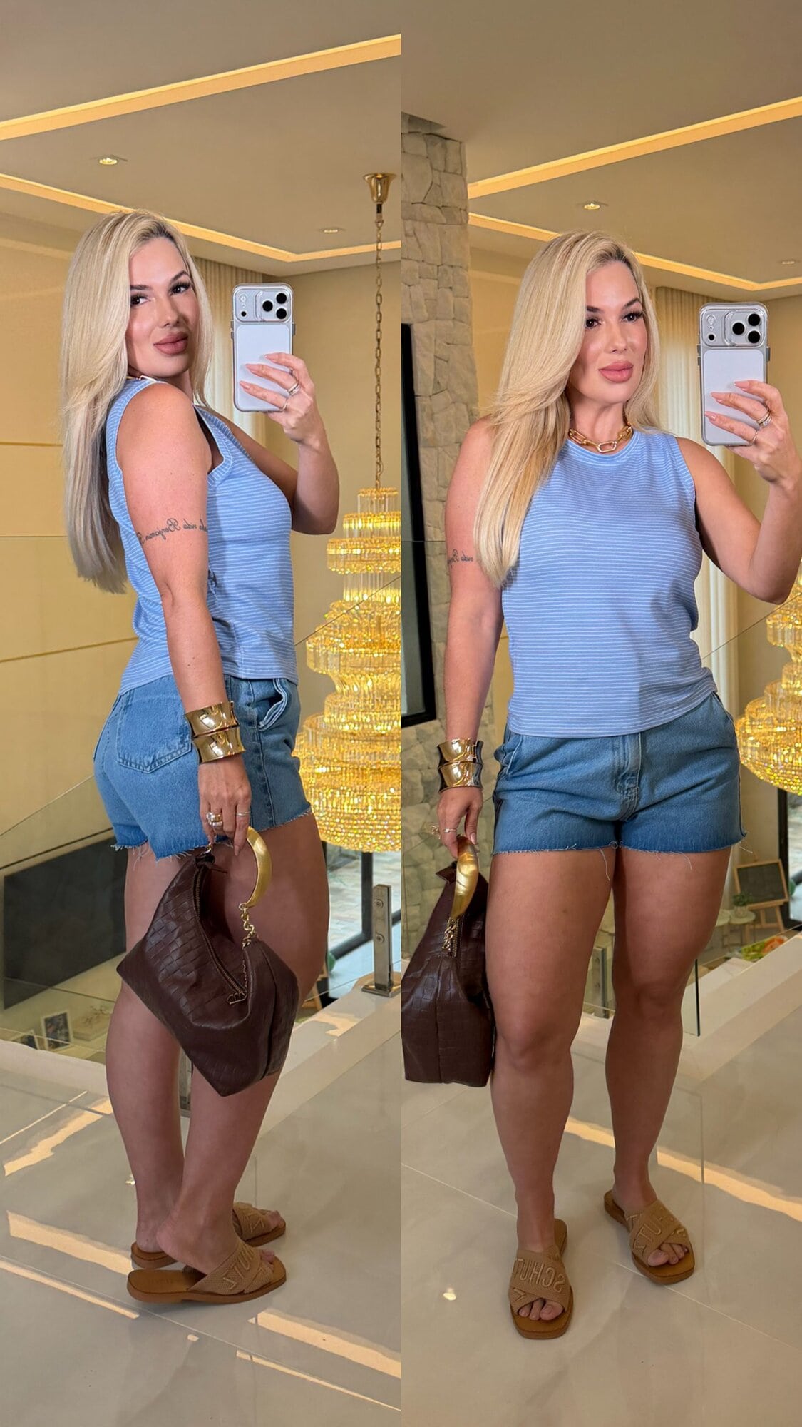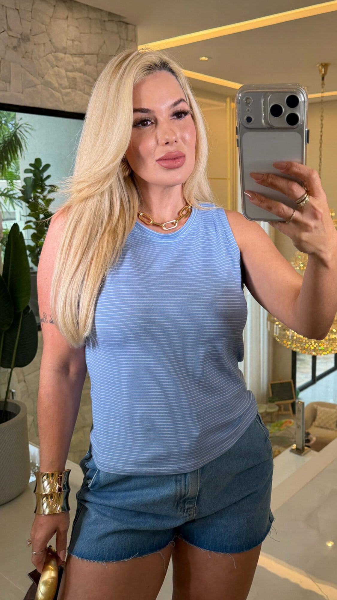 | Cor | Azul listrada, Azul Marinho, cinza listra branco, nude, verde folha |